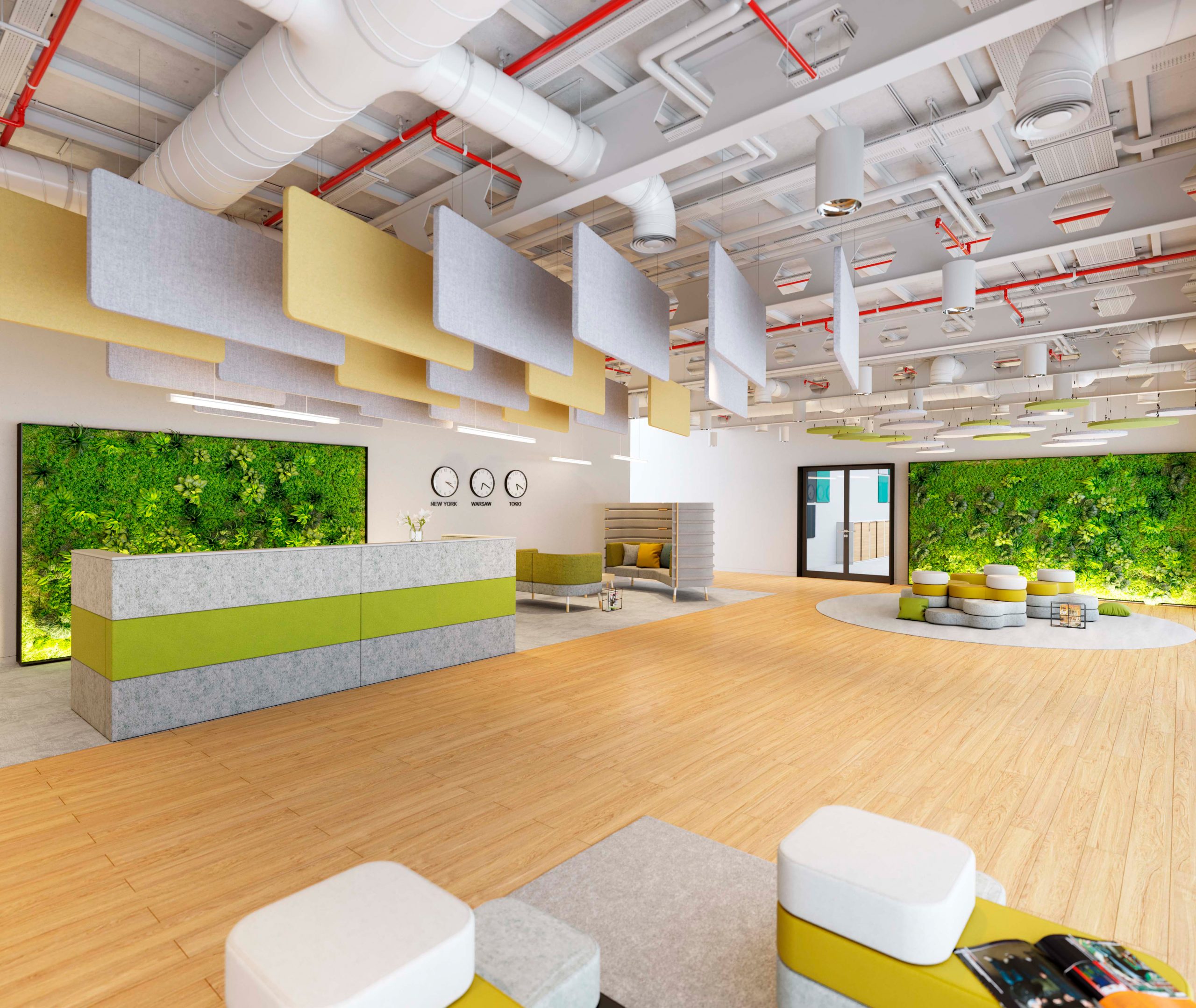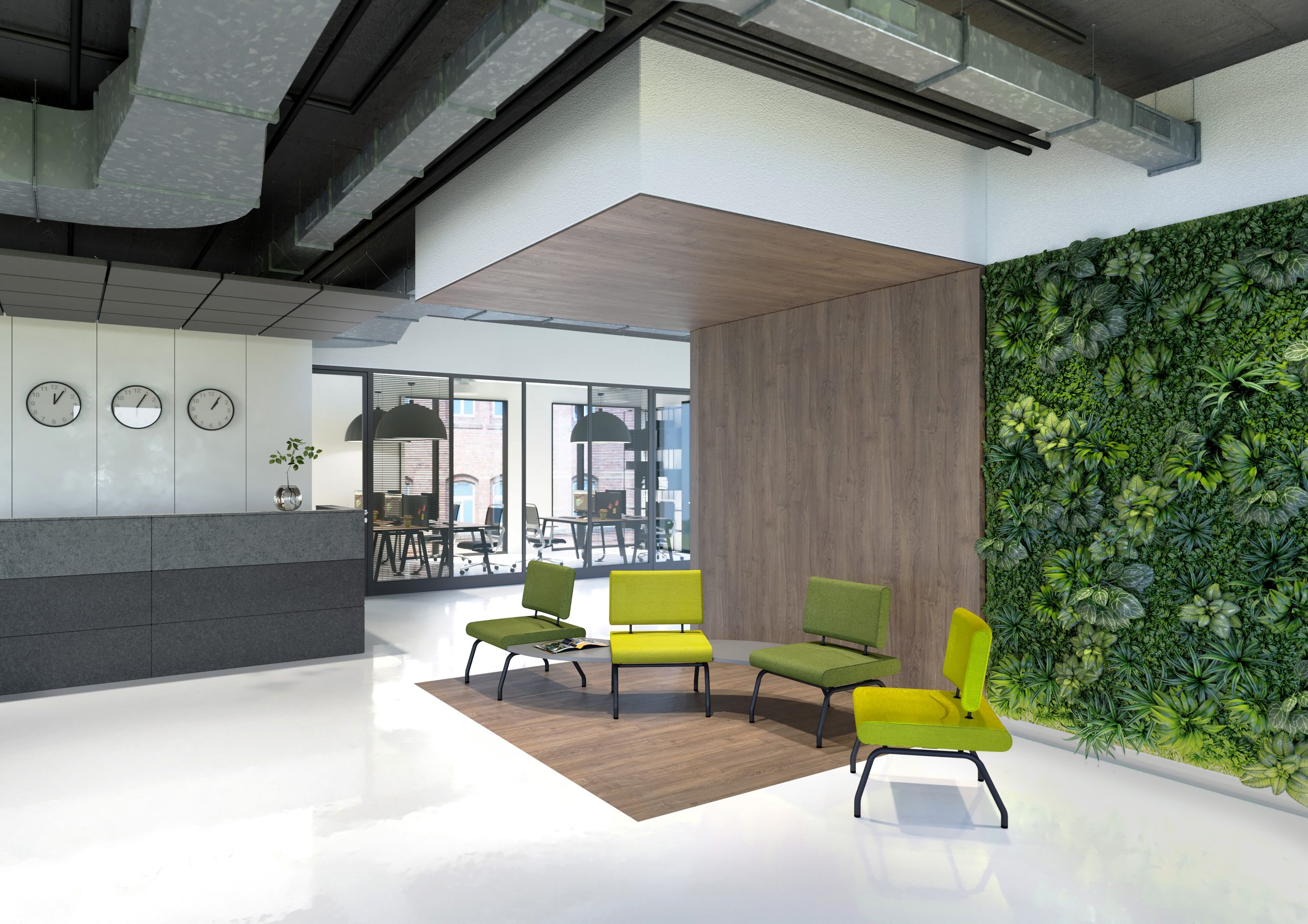 Bequeme Sitzmöbel, Beistelltische, Pflanzen und Akustikelemente schaffen eine angenehme Atmosphäre. Optional mit Kaffee-/Wasserstation, Präsentationsflächen oder Digital Signage.