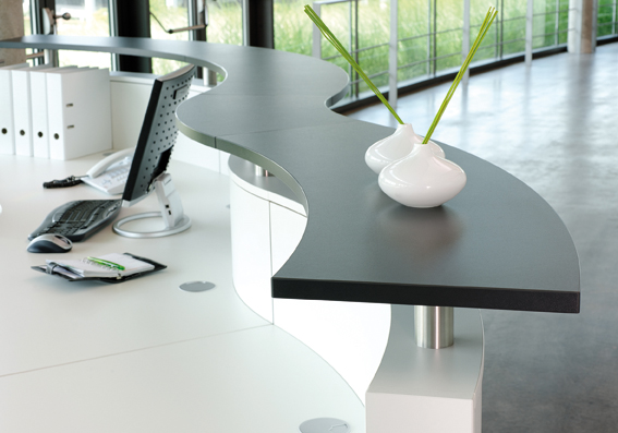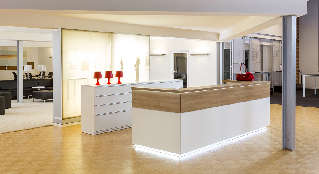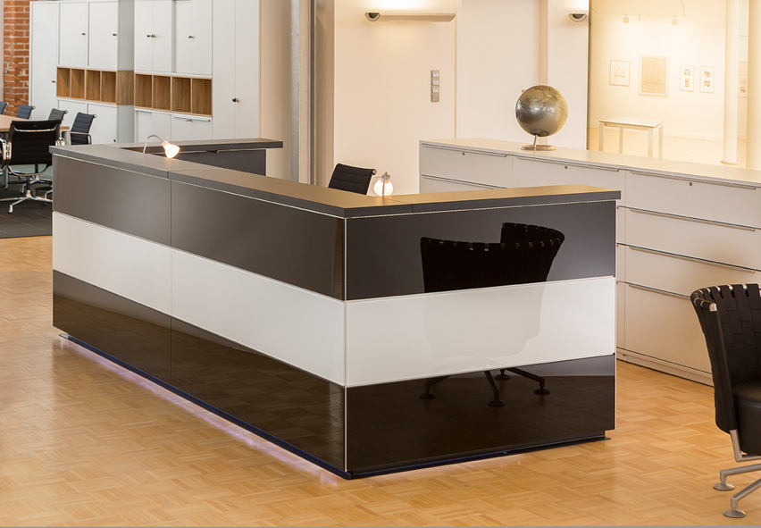 Integrierter Stauraum, Technikanschlüsse oder Tablet-Halterungen sorgen für reibungslose Abläufe am Empfang.